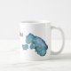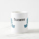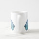 Drachenpuppen, die auf jeder Seite der Tasse abgebildet sind. Puppen werden aus Garnen in Blautönen mit weißen Flügeln hergestellt. Mutter beugt sich vor Babydrache. Drachen auf jeder Seite der Tasse mit personalisiertem Namen in der Mitte.