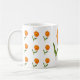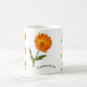 Orangenblüte des Single zentriert sich an der Vorderseite der Tasse mit dem gebogenen Titel "Calendula" unten rechts. Regentropfen sind sichtbar, die sich an den unteren Blütenblättern festhalten. Die Seiten der Tasse haben eine kleinere, Single Blüte multipliziert mit drei Reihen.