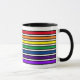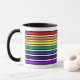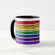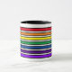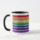 Die Farben des Regenbogens füllen die schwarzen Konturen gleichmäßig verteilter Balken, von oben rot bis unten violett. Die weiße Tasse zeigt sich in den Zwischenräumen durch.