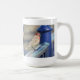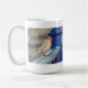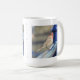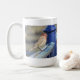 Roter Spatzen sitzt auf dem blauen Eisengeländer eines Zaunes. Das Bild wird auf jeder Seite des Textes "Guten Morgen" kopiert, der vertikal auf der Seite der Tasse läuft.