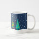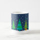 Modernes geometrisches Design aus fünf Tannenbäumen in aquamarin, türkis und goldgelb. Der Himmel ist Marine mit weißem fallendem Schnee.
