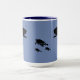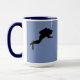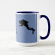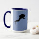 Taucher und Schildkröten in der Silhouette. Schwarze Bilder von zwei Tauchern und drei Schildkröten auf einem mittelblauen Hintergrund.
