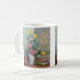 Malerei eines Vase Blumen und anderer Einzelteile auf einer Tischplatte vor einem Fenster