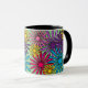 Diese Tasse hat ein Bauhaus-Design aus einer Mischung von Blume in Rosa, Püree, Blau und Gelb auf einem Feld von Grün.