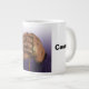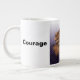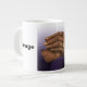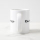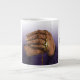 Weiße Tasse mit Kreuz über gefalteten Händen.