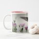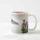 Blume und ein Kolibri erstrecken sich um eine zweifarbige Tasse.