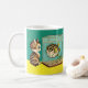 Eine Tasse mit Katze und Pufffisch, die sich überraschend anschauen
