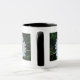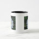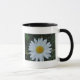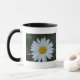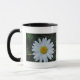 Eine grosse, weisse Margeritenblüte auf einem nen eibeigen Stäbchen, vor Dunklem, mit schwarzem dieser Tasse Rand und Henkel. Die für Rand und Henkel sind Farbbalken. Die Tasse ist in Varianten.