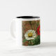 Diese Tasse "Weißes Zinnia und Rotes Zinnia" wird jeden Tag aufheitern, wenn sie dieses lächelnde Zinnia mit lebendigen Blätter sehen, die im Feld eines südlichen Bauernhofs an einem schwindelerregenden, heißen Tag auf der Spitze des Sommers geschossen werden.