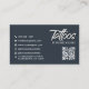 Moderne, elegante, berufliche Tattoo Artist Visitenkarte. Auf der Vorderseite der Visitenkarte befindet sich ein halb-Foto-Layout mit dem Typografie-Skript ''Tattoos'' in modernem, handgeschriebenem Schriftsatz und Ihrem Namen / Firmennamen auf dunkelmarinem grauem Hintergrund. Auf der Rückseite finden Sie die Kontaktdaten, den qr-Code und die Details zu den sozialen Medien. Sie können die Textgröße, den Schriftart, anpassen. Ideal für Tätowierkünstler, Tätowierwerkstatt, Tattoostudio..