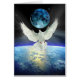 Eine weiße Taube des Friedens verbreitet seine Flügel über dem blauen Horizont von Planeten-Erde mit einem blauen Neonmond im Hintergrund. Der Sonnenaufgang-Glanz an der Kante der Welt und die hellen Strahlen baden die Erde. Dieses ist ein schöner Entwurf, zum des Weltfriedens und der Einheit für das neue Jahr, Tag der Erde oder für jede mögliche Gelegenheit zu fördern. Für Christen ist die Taube ein Symbol des Heiliger Geist, des Geists des Friedens oder des Geistes des Gottes.