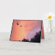 Diese schöne Geburtstagskarte fängt zwei Tauben ein, die in den Sonnenuntergang hinauffliegen. Der Himmel scheint mit Wolken in den Regenbogenfarben Rot, Orange, Gelb, Blau, Magenta und lila in Flammen zu stehen. Nur die Baumgipfel sind in schwarzer Silhouette zu sehen. Der Innenraum wiederholt die schönen Sonnenuntergangsfarben mit einer weiteren Taube. Der Text kann leicht für Ihren besondere Anlass angepasst werden.