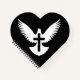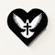 Weiße Taube Silhouette mit offenen Flügeln und ein Kreuz auf schwarzem Hintergrund.
