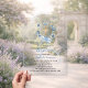 Ein klarer, transparenter Hintergrund, verziert mit wasserfarbenen blauen Blumen in einem Kranz, einem blauen Schleifen und einem goldenen Kreuz. Personalisieren und fügen Sie einen Namen und Details hinzu.
