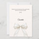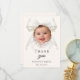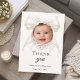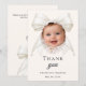 Eine moderne und elegante Taufe, Taufe Danksagungskarte für ein Mädchen. Ein weicher elfenbeinfarbener Hintergrund, verziert mit einer großen Schleife mit Perlen. Auf der Vorderseite der Text: Dankeschön, Foto, Name und Datum. Rückseite: Vorlage für Ihre Danksagung und Name.
