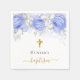 Für eine elegante Taufe, ein Baby zu feiern. Ein schick weißer Hintergrund. Blau-weiße Blumen, Rose und ein vergoldetes Imitat-Kreuz. Personalisieren und fügen Sie den Namen des Kindes hinzu. Schwarze und goldene Buchstaben.