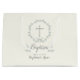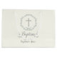 Blauer und grüner Blatt-Kranz dieses Frühjahrs erhellt Ihre Feier. Dieser Entwurf ist auf einem Hintergrund der hellen Creme, geschmückt mit einem schönen grauen Kreuz. Vervollkommnen Sie für die Taufe oder die erste heilige Kommunion Ihr Kindes. Karo heraus die zusammenpassenden Zusätze, die Geschenke, die Gastgeschenke und das Briefpapier.