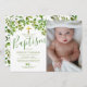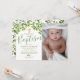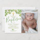 Gender-neutrale Taufe/Taufeinladungen mit einem klassischen, weißen Hintergrund, der in jede Farbe verändert werden kann, Aquarellbäume mit üppigem grünem Blattwerk, einem religiösen Goldkreuz, einem Foto Ihres Kindes und einer modernen Textvorlage, die leicht zu personalisieren ist.