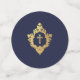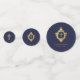 Confetti für die Taufe eines Jungen. Auf dem kleinsten Konfetti gibt es auf beiden Seiten ein Imitat-Goldfolie-Kreuz auf marineblau-blauem Hintergrund. Auf der mittleren Konfetti, das gleiche Kreuz ist in einem Vintagen Imitat Gold Wappen, auf dem gleichen marinen Hintergrund. Auf der größten Konfetti, auf der einen Seite, unter dem Wappen mit dem Kreuz, gibt es goldenen Text: der Name, der Anlass und das Datum. Auf der anderen Seite gibt es ein Foto mit einem Platzhalter für einen kleinen Jungen. Das Platzhalter-Foto eines Babyjungen in einem marineblauen Anzug ist KI generiert.