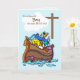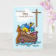 Noahs Arche auf der Taufkarte eines blauen Jungen ist so wertvoll. Die Tiere schauen aus Noahs Arche und sehen das Kreuz durch die Wolken. Sweet card, um einem Jungen zu geben, wie er getauft ist.