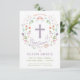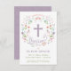 Diese elegante und hübsche Taufe, die Taufe, lädt zu einem illustrierten Blumenkranz ein, bei dem das Wort "Taufe" um ein Kreuz herum steht. Die Textfarbe, der Schriftart und die Nachricht können nach Ihren Wünschen geändert werden. Auf der Rückseite des Einladens befindet sich ein lila Hintergrund (der in eine beliebige Farbe getauscht werden kann) mit einem weißen Quartrefolienmuster.