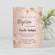 Der goldgelbe Hintergrund mit goldenem Eukalyptus und goldenen Imitaten mit goldenem Glitzer ist rot und Rose. Personalisieren und einen Namen und Zeremonie Details. Schwarze Buchstaben.
