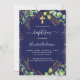 Marineblau mit Eukalyptusgrün und goldenen Blätter und Imitaten goldenen Glitzer Glitzern. Ein goldenes Kreuz. Personalisieren und den Namen und die Zeremonie Details des Kindes. Zurück: marineblau Hintergrund.