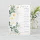 Elegantes und elegantes weißes Rosen- und Eukalyptus-Gebetskartendesign mit dunkelgoldfarbenen Konfetti und Schatten und einem sepia goldfarbenen einfachen Kreuz. Zurück zeigt ein Aquarellgradientengrün mit grünen und dunkelgoldfarbenen Konfetti-Spritzern.