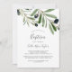 Diese moderne Olivenzweig-Taufveranstaltung ist perfekt für eine boho Baby-Taufe. Das rustikale und dennoch elegante Design besticht durch einfache botanisch-grüne Blätter und schwarze Oliven auf einem kleinen Ast mit klassischem mediterranem Ambiente.