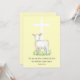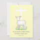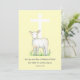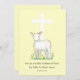 Eine Taufkarte mit einem weißen Lamm, der mit Tinte und farbigem Bleistift mit weißem Kreuz auf einem weichen gelben Hintergrund geschmückt ist, wird von einer Taufe begrüßt. Sie können die Rückseite mit Text anpassen, den Sie bearbeiten können, um zu sagen, was Sie möchten.
