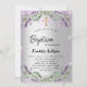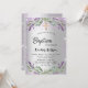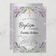 Eine moderne, stilvolle und glamouröse Einladung für eine Taufe, die ein kleines Mädchen feiert. Ein silbernes Imitat mit violettem Imitat Glitzer, Glitzern, Lavendelblumen, Blume und Eukalyptusgrün. Der Name ist mit einem modernen handgeschriebenen Stilskript geschrieben. Personalisieren Sie Ihre Daten und fügen Sie sie hinzu.