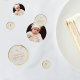 Auf der einen Seite der größten und der medianen Konfetti, gibt es ein Platzhalter-Foto eines Babys in Weiß von Vera Kratochvil von Public Domain Pictures; es hat Modell-Release. Auf der anderen Seite ist goldener Text in einem weißen Marmorzirkel mit Imitaten goldenen Folie, und ein Imitat mit goldenem Rand ist darüber. Der Name ist in einem eleganten kalligrafischen Skript geschrieben. Der kleinste Konfetti hat auf beiden Seiten nur das Kreuz im goldenen Kreis.