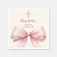 Creme, beige Hintergrundfarbe. Die Einrichtung besteht aus einem großen rosa Bug und einem goldenen Kreuz. Personalisieren Sie den Namen und das Datum und fügen Sie diese hinzu.