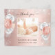 Eine elegante Dankkarte mit Foto. Eine Rose goldener Hintergrund, ein weißer Rahmen, Imitate Glitzern, Rose Gold Rose, Blumengestelle. Ein goldenes Kreuz. Personalisieren und fügen Sie ein Dankeschön Note, Foto des Babys Mädchen und Name. Schwarzer Text.