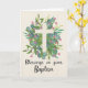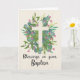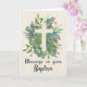 Diese Taufkarte ist für ein Mädchen und hat Eukalyptus und Farne unter einem einfachen Kreuz angeordnet. Der Text lautet "Segnungen auf Ihrer Taufe".
