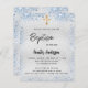 Eine moderne, elegante Taufe, die einen kleinen Jungen feiert. Imitat silber aussehender Hintergrund mit blauen Imitaten Glitzer Glitzern und einem goldenen Kreuz. Personalisieren und fügen Sie einen Namen und Party-Details hinzu. Schwarze Buchstaben. 1 Blatt = 1 Einladung mit Druckkante bis zur Kante