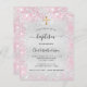 Eine moderne, elegante Taufe, die ein kleines Mädchen feiert. Imitate silbermetallischer Hintergrund mit rosa Imitaten Glitzer Staub und einem goldenen Kreuz. Personalisieren und fügen Sie einen Namen und Party-Details hinzu. Schwarze Buchstaben.