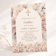 Eine moderne, stilvolle und mädchenhafte Einladung zur Taufe. Creme, pfirsichfarbener Hintergrund, Bogenrahmen, mit cremefarbenen Blume verziert. Personalisieren und fügen Sie Ihren Namen und die Details.