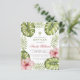 Diese tropische Einladung zur Taufe eines Mädchens hat einen Rahmen aus tropischem Blattwerk - Monstera und Palmen Blätter - und rosa chinesische Hibiskus Blume (Rose der China). Über dem Text ist ein grünes Kreuz. Der Anlass ist in grünen Kappen geschrieben, der Name in einem eleganten roten kalligrafischen Skript. Die tropischen Blätter und die Blume sind Aquarellfarben, die von laomao_art aus Pixabay gemalt wurden und für kommerzielle Nutzung frei sind.