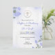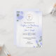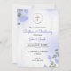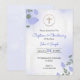 Eine Taufeinladung mit floralem Design. Es enthält zarte violette und grüne Blätter, ein goldenes Kreuz und eleganten Schrifttext.