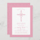 Diese stilvolle und moderne kleine (4,5" x 6,25") Taufe oder Weihnachtseinladung mit einem eleganten rosafarbenen Kreuz und einer koordinierenden rosa Grenze. Die Hintergrundfarben vorne und hinten sowie der Text können für Ihren besonderen religiösen Anlass angepasst werden.