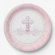 Teller aus Taufpapier mit hübsch rosa Perlenschwirl kreuzen auf einem rosa Damast-Hintergrund. Diese eleganten, rosa Taufpapier-Teller lassen sich einfach durch einfaches Hinzufügen von Texten anpassen. Sie können das Kreuz auch nach Bedarf auf diesen rosa Damastettismus, Taufe und ersten kommunion paper Tellern bewegen.