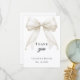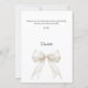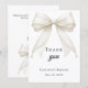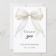 Eine moderne und elegante Taufe, Taufkarte zum Dankeschön. Ein weißer Hintergrund, verziert mit einer großen elfenbeinfarbenen Schleife mit Perlen. Auf der Vorderseite der Text: Dankeschön, Name und ein Datum.