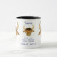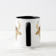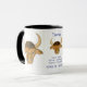 Eine weiße Ringer-Tasse mit schwarzer Lippe und einem Stier, vorne und hinten, aus einem Aquarellbild von Judy Adamson. Zwischen den beiden Bullen ist ein kleineres Bild von einem Stier, die Daten und die vier positivsten Eigenschaften eines Taureans. Es stehen auch passende Grußkarten, Geschenke und T - Shirt zur Verfügung.