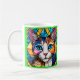 Taza de café con un encantador diseño de gato en estilo vitral (Misc Stained Glass), lleno de colores vibrantes y formas geométricas que capturan la luz con un efecto artístico y moderno.