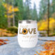 Die Liebe Inspiriere Lehrer Sonnenblumen Moderner Personalisierter Name Thermal Wine Tumbler Features mit dem Text "Teach Liebe Inspirier" in einer lustigen modernen leopard Print-Schrift Typografie und mit einem Herz und Sonnenblumen und personalisiert mit Ihrem individuelle Name. Ideal für die Lehrerfreundlichkeit zu Weihnachten, Geburtstagen und Feiertagen. Designed by ©2025 Evco Holidays www.zazzle.com/store/evcoholidays