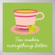 Ein niedlicher Tee-Tee-Cartoon macht alles besser. Die Einrichtung ist in Pastellfarben gehalten. Teefans kommen hier auf ihre Kosten. Niedliches Geschenk für Teeliebhaber. Küchenkunst.