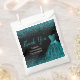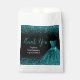 A beautiful teal blue themed elegant watercolor dress gown on a black background with faux glitter at the top and bottom of the favor bag.