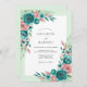 This design features a lush arrangement of watercolor teal and blush pink peonies. Delicate mint green foliage provides a soft, airy backdrop for the vibrant floral clusters. The painterly style creates a romantic and sophisticated aesthetic perfect for a seasonal spring event. Vibrant turquoise blooms pair beautifully with soft pastel accents for a fresh botanical look.
