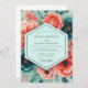 A dramatic and artistic design featuring a lush arrangement of painterly botanicals. A bold color palette contrasts deep teal and turquoise hues with vibrant shades of coral and salmon pink. Detailed roses and peonies create a romantic yet modern atmosphere for your special day.